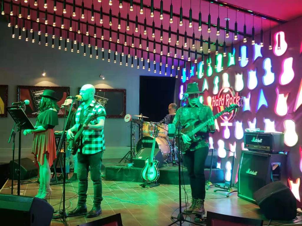 This is a quick write up of the Hard Rock Cafe only and not the hotel. There is live music on Thursday/Friday and Saturday, and it runs from 7-11pm. The band is excellent and covers all the rock classics you would expect.