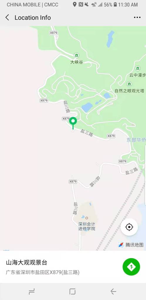 Start at this location. Follow the sign up to the top. After you have finished you can end at OCT EAST and get a taxi. Type this into map or into didi 山海大观观景台