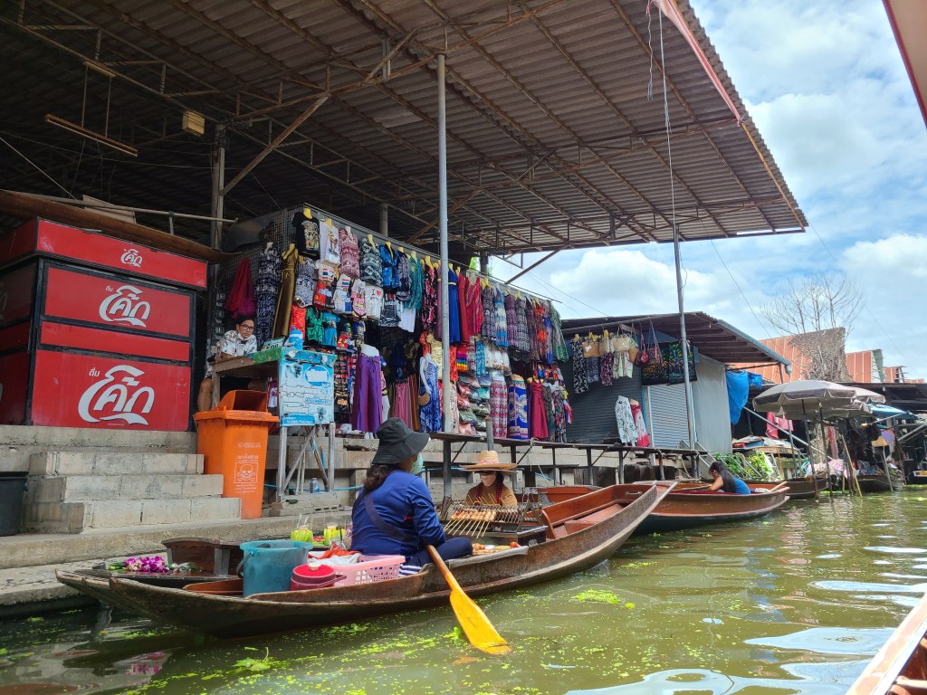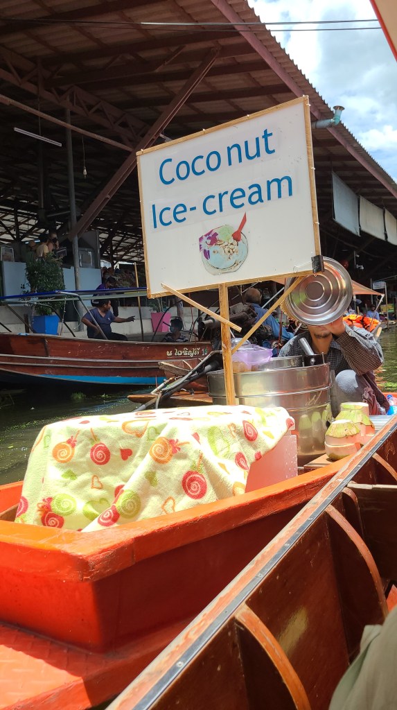 You go around and stop where you request. Some sellers have fixed stalls some have boats that come to you. The coconut ice cream selling boat had some delicious stuff. You can barter on prices but don’t be too harsh, they are only trying to make a living. You can buy art, trinkets, clothes, toys and the usual souvenir stuff.